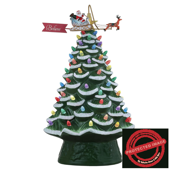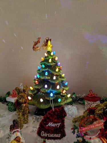 🎄 16” ceramic green Christmas tree with Santa sleigh topper
